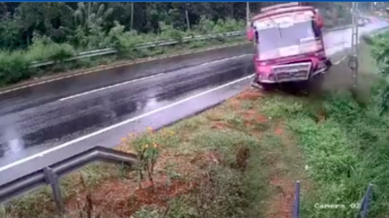 சாலையில் சறுக்கி தாறுமாறாக ஓடிய பேருந்து; ஓட்டுநர் சாமர்த்தியம், தடுப்புக்கம்பியால் தப்பிய பயணிகள் உயிர்.