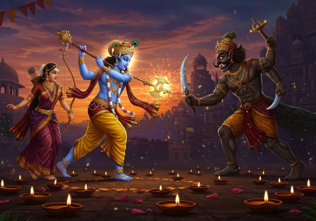 - கிருஷ்ணர், சத்யபாமாவுடன் போர் செய்து நரகாசுரனை அழித்தார்.