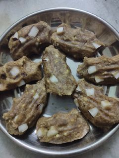 - இந்தக் கலவை ஒன்று சேர்ந்து, ஈரப்பதம் நீங்கும் வரை கிளறி, பூரணத்தைத் தயார் செய்து ஆற விடவும்.